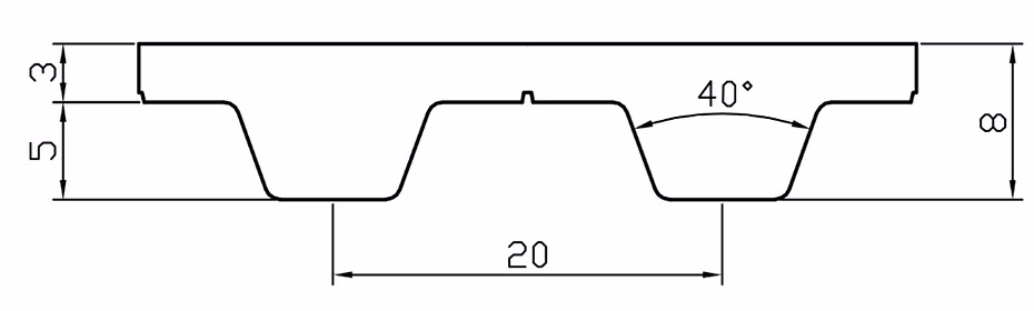 Das T20-Profil ist trapezförmig. Zahn und Zahnlücke sind bei diesen Riemen nahezu gleich groß. Der Abstand von Zahnmitte zu Zahnmitte beträgt bei dem T20-Profil 20 mm.